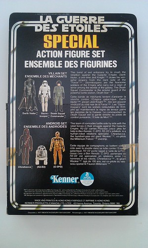 In an attempt to save money by "not having to re-invent the wheel" Kenner Canada used the same design template as their US counterparts but had to make a number of changes because of the law regarding Bi Lingual packaging. As a result the canadian set also has the text: "Ensemble des Figurines."