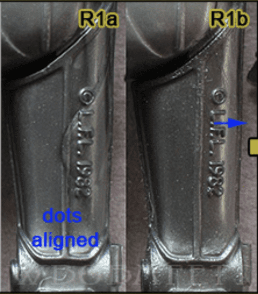 The dot after the first 'L' of 'L.F.L.' has shifted position very slightly. I used a magnifying glass on my own figures and it was still tough to see, but I think I've got it right! A bigger difference to my eye is the position of the horizontal line forming the lower part of the first 'L'. In the R1a it is angled downwards, whereas in the R1b it is angled upwards.